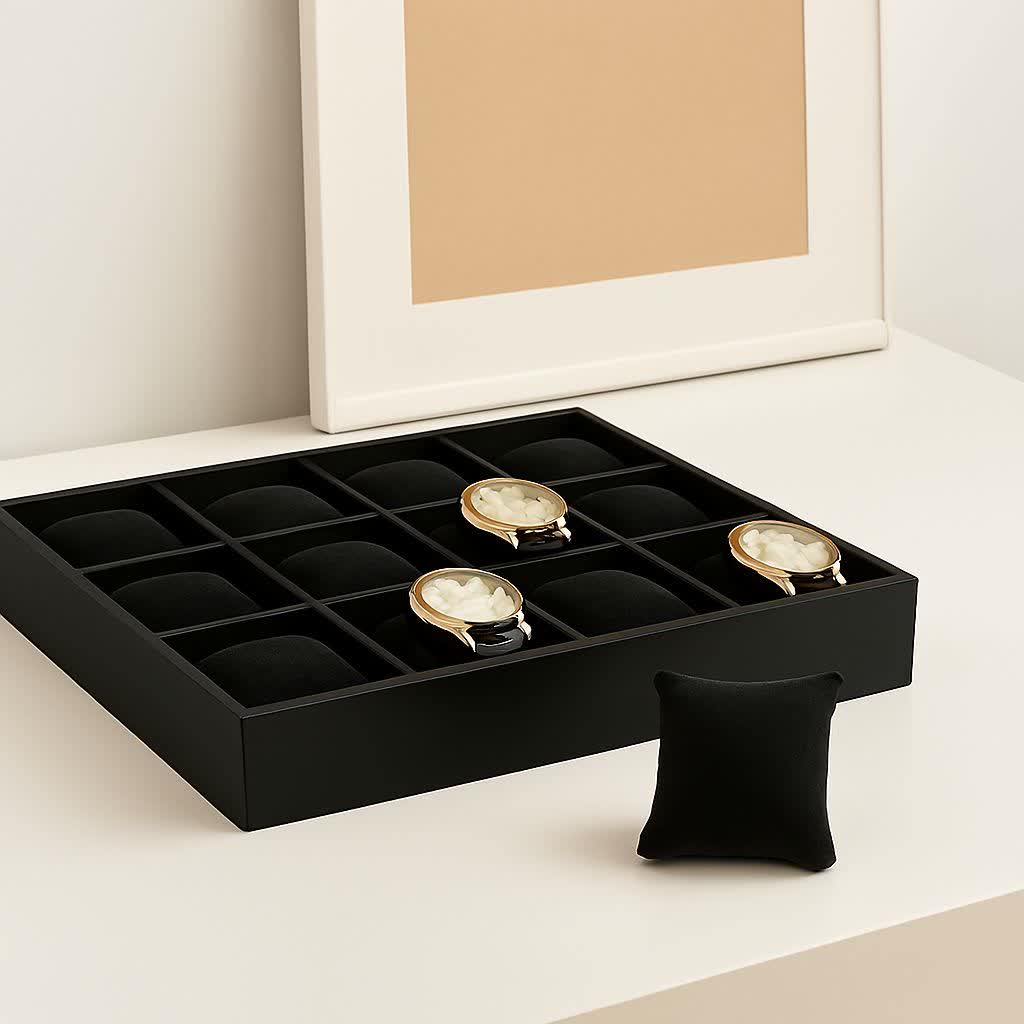 بالشتک های مشکی مخملی، از ساعت‌ها محافظت کرده و جلوه‌ای حرفه‌ای به نمایش آن‌ها می‌دهند.